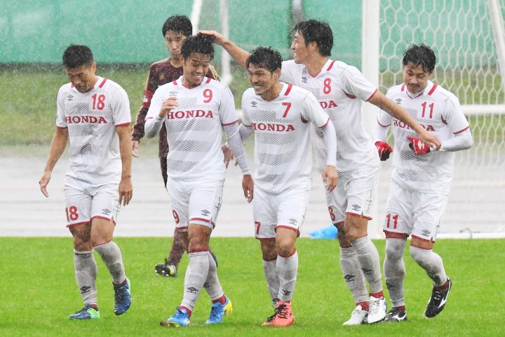 | 2017年10月22日に行われました第19回JFL2nd-ステージ第12節 Honda FC対流経大ドラゴンズ龍ヶ崎は4-0でHonda FCが勝利しました。 第19回JFL2nd-ステージ第12節、台風21号の影響を受けた悪コンディションの中、力の違いを見せつけ4-0の完封勝利で首位を堅守。 ポゼッションサッカーを軸にゲームを展開するHondaにとっては不利な状況かと思われた悪条件の中、体力、技術力の差が浮き彫りとなる。 開始早々から縦横無尽に前線を掻き回す久野が7分、14分と決定機を迎えるもGKの好守で得点できない。守備に関しては要所要所で相手攻撃陣の芽を摘み取り形をつくらせない。 優位に進めるHondaの得点は30分、自陣FKをGK楠本が前線へ蹴り込むと久野が競り合いゴール前に流れたところを大町が技ありシュートで先制する。 その後もCKから大町、川嶋らがヘディングシュートを放つも僅かにゴールを外れ追加点が奪えず前半を終了。 後半に入り更に天候は悪化するもHondaペースは変わらない。 52分に古橋のスルーパスを受けた久野が冷静に蹴り込み追加点を奪う。 悪天候を感じさせないボール運びと個人のテクニックで更にゴールシーンは広がる。 62分に右サイドの細貝からクロスが入ると大町がこの日2点目となるゴールを演出。続けて63分には松本を起点に中央をこじ開けると久野とのワンツーで4点目となるだめ押し点を決めた。 次節は2017年10月29日(日)都田サッカー場にて第19回JFLセカンドステージ第13節 FC大阪戦が13時キックオフで行われます。 現在 2位青森との勝ち点差は「4」、次節の結果次第(Honda勝利、青森敗戦)では2nd-ステージ1位と念願のJFL完全優勝が確定致します。 引き続きご声援宜しくお願い致します。 ![]() ![]() ![]() | ![]() ![]() ![]() ![]() ![]() ![]() ![]() ![]() ![]() |